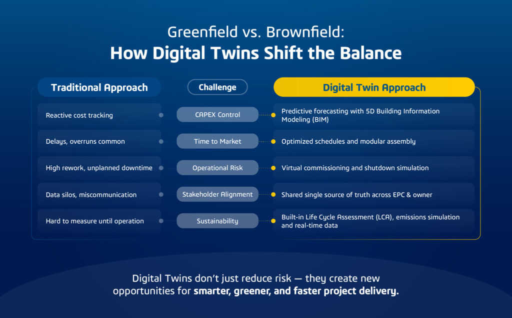 These examples illustrate how Digital Twins de-risk both paths: clean-slate sustainability for greenfields, and fast, efficient modernization for brownfields.