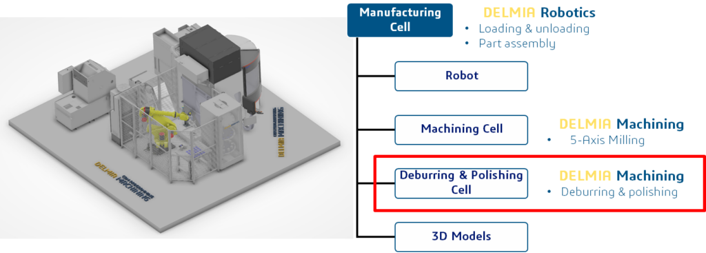 This scenario was originally conceived for the Innoteq trade show 2025. Switzerland’s premier trade fair for the manufacturing industry. It combines DELMIA Machining, Robotics and Virtual Commissioning to implement a fully automated production cell. The scope of this tutorial is limited to the Deburring & Polishing operations.