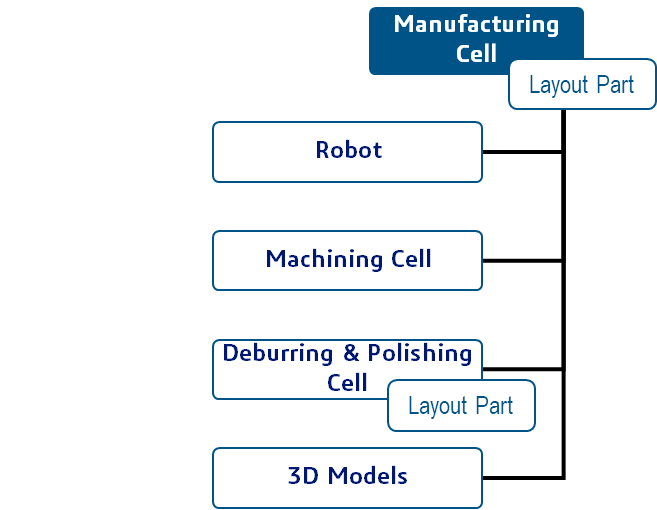 To make sure the positioning of the different objects within the cells is consistent, a common part (Layout Part) is shared between the cells. This part contains coordinate systems defining the positions of all objects present in the cells. It is first defined when planning the layout of the entire cell (top node) and is then reused when building the cell for Deburring & Polishing.