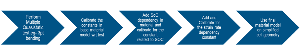 Subsequently, the material model incorporates State of charge (SoC) dependency by introducing a field variable, effectively modifying the material model to include an exponent (m) related to the SoC. This adjustment ensures that the simulation model accurately replicates test results across different SoCs. The material model is refined to account for strain rate dependency, aligning simulation outcomes with empirical data for specific strain rates.