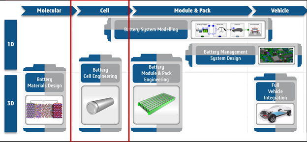 The properties derived from these materials can then be applied in continuum-level simulations. This approach extends to simulations at the cell, module, and pack levels, optimizing battery systems’ design, performance, and efficiency. Different methodologies are employed at the battery cell level to tackle engineering challenges, which are carried through to the module and pack levels to provide comprehensive solutions.