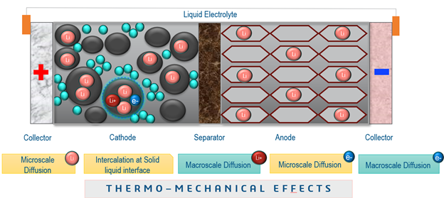 Due to their multiple advantages over other battery types, lithium-ion batteries have become the backbone of rechargeable batteries used in EVs. The electrochemical performance of these batteries depends on the interaction between various diffusion processes. During charging, lithium ions are intercalated through the electrolyte. At the same time, electrons flow through the external circuit, highlighting the duality of macro-scale diffusion for lithium ions and micro-scale diffusion for electrons. Conversely, during discharging, the processes reverse, underscoring the importance of examining ion and electron movements to assess overall battery performance.