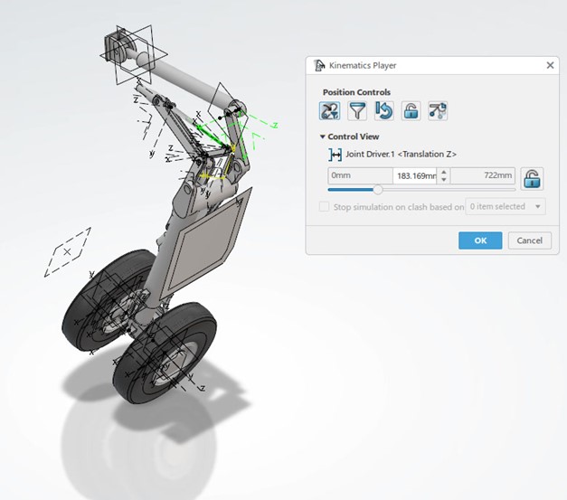 Once the motion simulation model is set up, designers have powerful/advanced motion-specific features at their disposal. Using an easy-to-use online kinematics player, the designer can validate the kinematics of the landing gear mechanism by adjusting joint positions with sliders, ensuring it retracts/extends correctly, and/or that the lock strut is in the correct position.