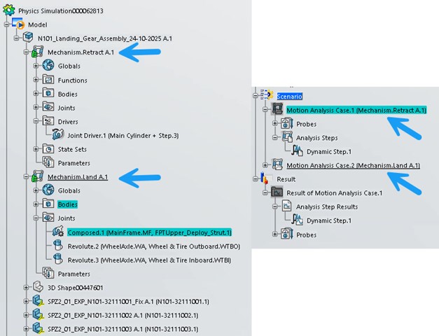 A typical workflow involves the designer creating parts for the various components of the landing gear and defining the connections/constraints (named engineering connections in the 3DEXPERIENCE platform) between them to establish the assembly kinematics. They can then simply launch one of the motion apps to automatically generate a motion mechanism and simulation model that contains the bodies and joints representing the different components and their connections, respectively.