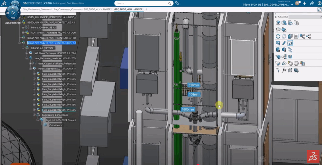 C’est notamment dans le cadre de la résidence étudiante Belle-Beille à Angers, qu’a été mise en place une démarche de construction industrialisée adossée à un jumeau numérique. A travers une approche collaborative entre les entreprises Bouygues Construction et BAUDET, le jumeau numérique a permis l’intégration des modèles de salle de bains BAUDET, d’en récupérer la géométrie exacte et les points d’interfaçage pour Bouygues Construction.