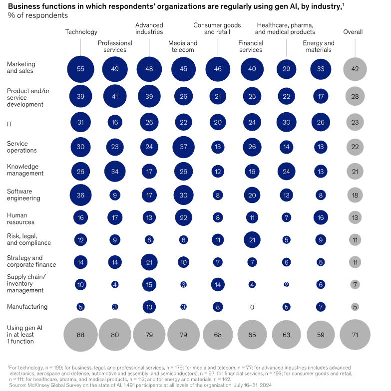 The impact of generative AI extends far beyond gains in operational efficiency: it goes right to the heart of corporate strategy. Organizations that successfully implement AI transformation strategies have some fairly important traits in common. AI governance led by senior management (CEO, COO) is the number one success factor. Organizations in which AI initiatives are overseen by senior management often report a significantly greater financial impact. This strategic involvement ensures the allocation of the necessary resources and the necessary organizational alignment. The widespread adoption of generative AI is also changing the skills required at every level of organizations. The financial sector is characterized by its particularly intensive use of generative AI in risk, legal, and compliance departments, with an adoption rate which is twice that of other industries.