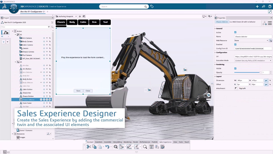Engineers work on the product in the normal way: they prepare 3D models, parts and assemblies, and apply configuration definitions from above. The output of this work is the Product Virtual Twin – a configurable engineering bill of materials (EBOM). In a typical case, this product twin/EBOM contains far too many details for a sales situation. Therefore, the 3DEXPERIENCE platform provides the capability to develop a connected configurable Commercial Twin. This lightweight, visualized and configurable 3D representation is ideal for CPQ usage, and is fully connected to the original Product Virtual Twin, instead of an exported stand-alone 3D model.