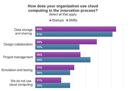 Cloud computing is quietly reshaping the innovation process. 61% of respondents use the cloud for data storage and sharing, and 40% each for design collaboration and project management.