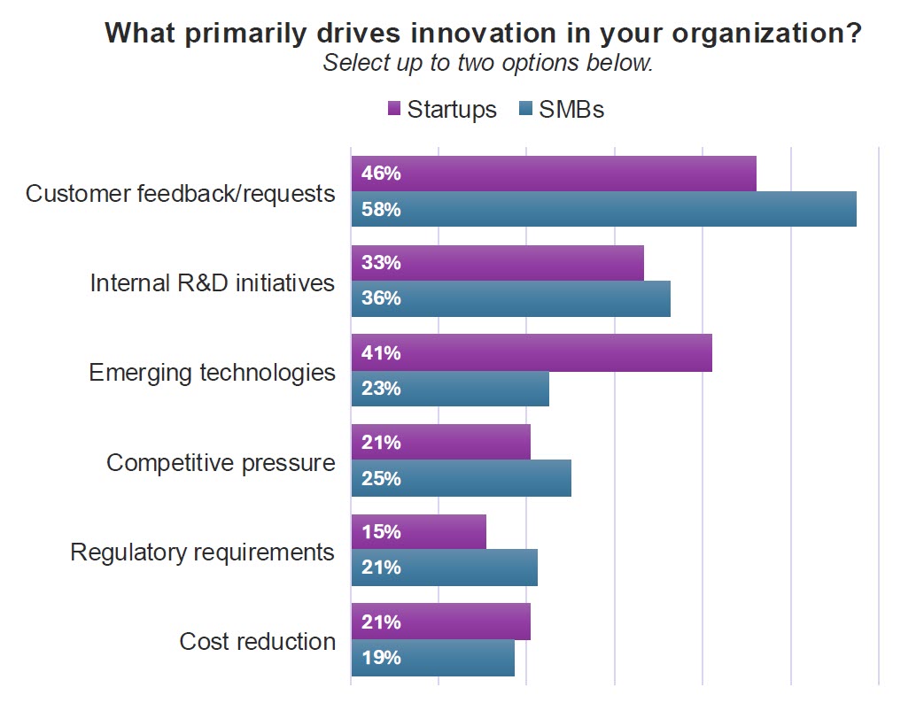 Startups, however, diverged. While customer input remained important (46%), emerging technologies (41%) surpassed internal R&D (33%) as their next major driver.